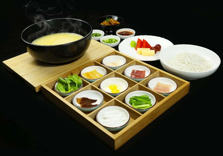 董郎過橋米線中的湯選用云南大山中的土雞,提煉其骨中的精髓為主料,與當(dāng)歸、黨參、淮山藥等名貴藥材配伍,再經(jīng)過數(shù)十道工序,去其糙粕,保留原料精華,不用任何鐵器而采用特殊砂鍋熬頓而成,其營養(yǎng)成分遠遠超過普通的雞湯。董郎過橋米線湯清味濃、咸鮮可口,富含膠質(zhì)蛋白,植物氨基酸多種礦物質(zhì)元素,潤膚養(yǎng)顏、固腎培元、養(yǎng)血安神、和肝養(yǎng)胃。其中的米線選用優(yōu)質(zhì)大米和糯米,采用先進的制作工藝,不含任何的防腐等各種添加劑,潔白似雪、晶潤如絲、口感爽滑勁斗,清新糯香。