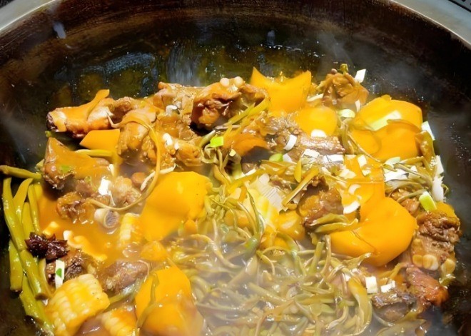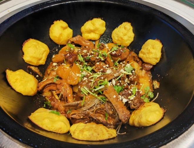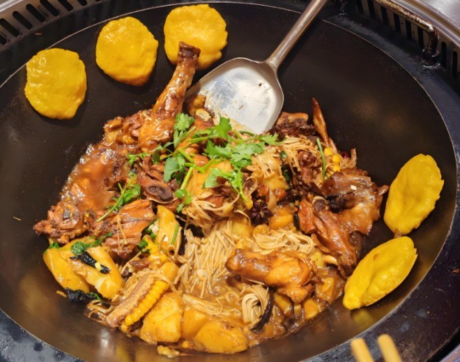 大嫂鐵鍋燉的第一口鐵定是留給雞肉的,外層裹滿了醬汁,燉得軟嫩入味,一口滿足。雞肉翻炒入味后,加水等待沸騰,將和好的玉米面貼到鍋邊,蓋蓋靠燉水蒸氣加熱,玉米餅很是香甜,中間松軟,邊緣酥脆,蘸點(diǎn)湯汁回味無窮。如果再加入靈魂粉條,這一鍋鐵鍋燉可以讓四口之家吃的滿足。
