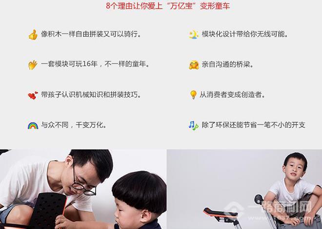 二胎的開放促進(jìn)了兒童玩具市場的消費(fèi)升級。萬億寶DIY變形童車,幾十種的組合模式,自由選擇,酷炫的設(shè)計(jì),百變的造型,品質(zhì)高、系列多,在市場積攢了很高的人氣,是個(gè)吸金的項(xiàng)目,創(chuàng)業(yè)的好選擇。